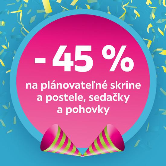 - 45 % na plánovateľné skrine a postele, sedačky a pohovky