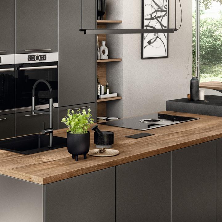 Kuchyňa Atlantis 938 vyniká detailmi, ktoré nenápadne dotvárajú celý dizajn. Pracovné plochy v čiernej farbe dodávajú kontrast, zatiaľ čo otvorené police a praktické zásuvky ponúkajú dostatok úložného priestoru. Táto kuchyňa je navrhnutá pre tých, ktorí hľadajú kombináciu moderného dizajnu a funkčných riešení v jednom.