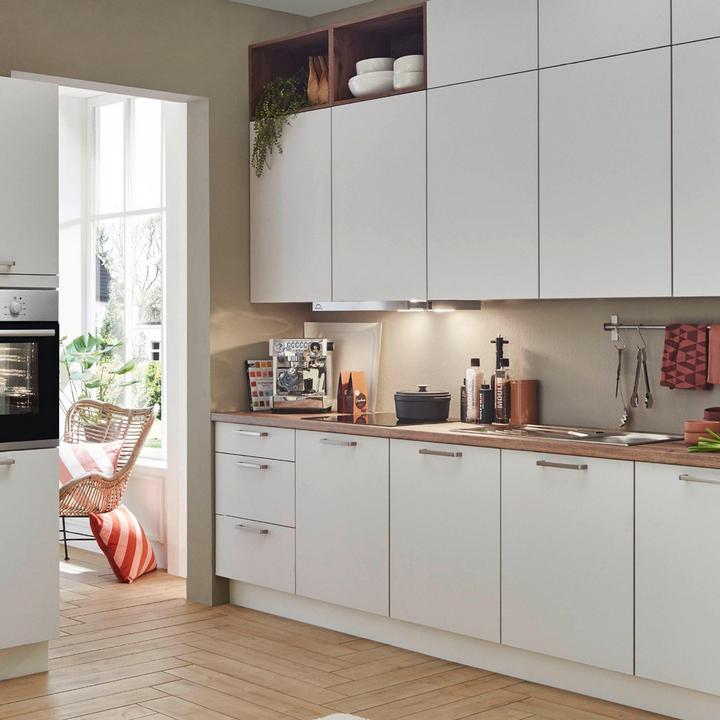 Kuchyňa Las Vegas 427 v alpskej bielej farbe spája moderný dizajn s praktickými prvkami, ktoré uľahčujú každodenný život. Čisté línie a jednoduché povrchy vytvárajú vzdušný priestor, zatiaľ čo otvorené police ponúkajú skvelé možnosti na vystavenie dekorácií alebo praktických potrieb. Všimnite si štýlové zabudované spotrebiče a kompaktný jedálenský kút, ktorý je ideálny na rýchle raňajky či pohodlné večere. Tento dizajn dodáva kuchyni čistotu a sviežosť, pričom maximalizuje využitie priestoru.