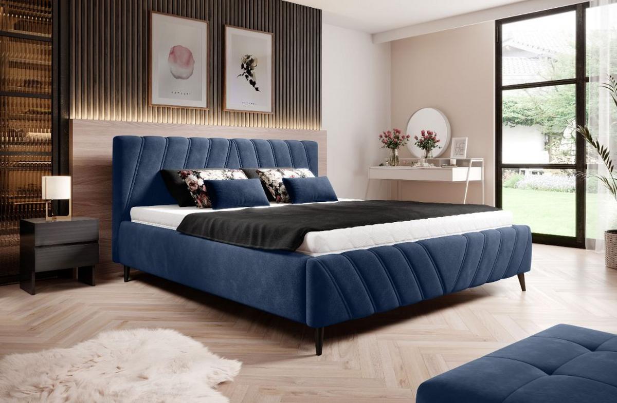 Čalúnená posteľ Melli s tmavomodrým poťahom a s nastavením výšky roštu