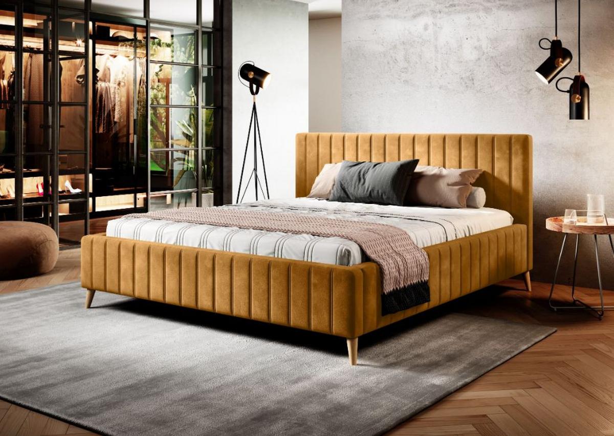 Okrovo žltá čalúnená posteľ Tamina s ozdobným prešívaním a drevenými nohami