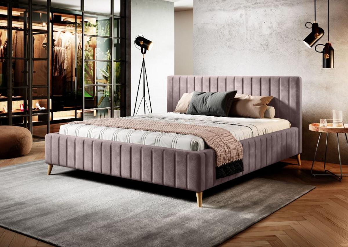 Čalúnená posteľ Tamina s ozdobným prešívaním, roštom a drevenými nohami