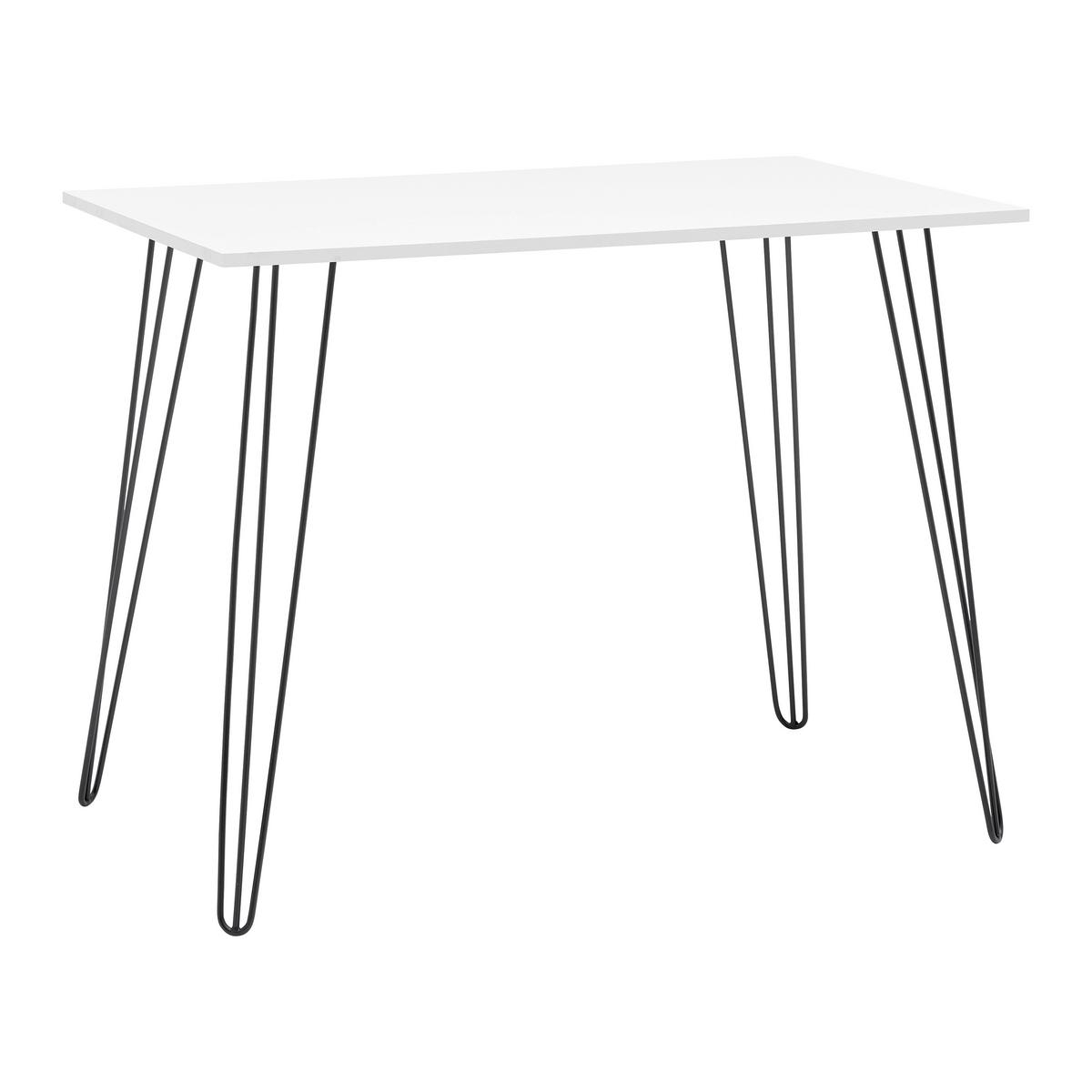 Tento artikel je k dispozícií iba ONLINE.Skvelý stôl v bielej ponúka malé a praktické pracovné miesto. Doska z MDF, nohy z kovu v čiernej, ľahko skombinujete v každom interiéry.Je možné ho využiť aj ako jedálenský stôl do menších priestorov.