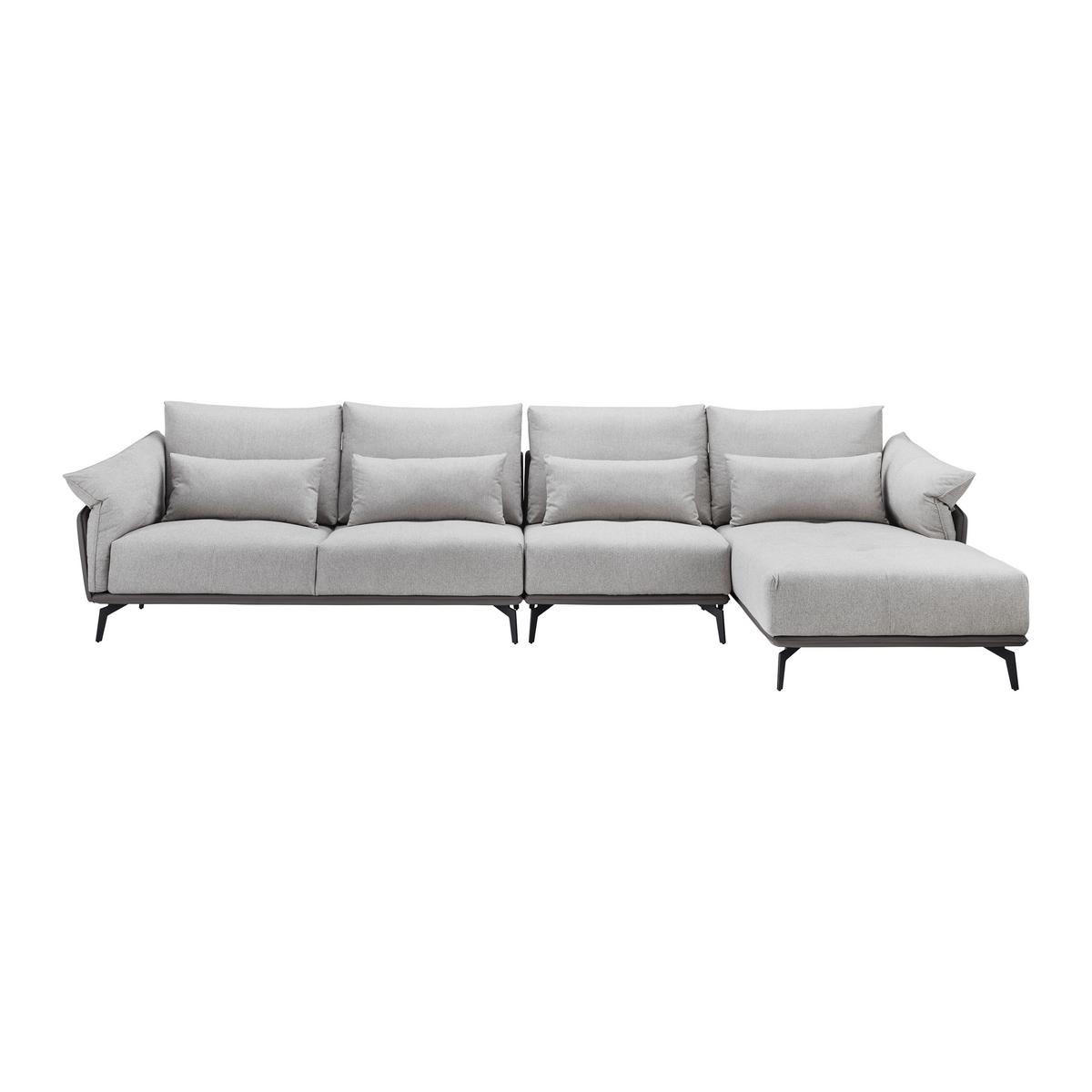 Tento tovar je k dispozícií IBA ONLINE. Táto sedacia súprava vo svetlosivej farbe boduje jednoduchým vzhľadom a jemnou farebnou kombináciou perfektne zapadá do rôznych štýlov. S veľkosťou približne 364 x 88 x 172 cm (Š x V x H) je súprava v tvare písmena L skutočnou oázou pohody domova. Vysoko kvalitný poťah zo zmiešanej textílie, ako aj z vlneného podkladu a penového čalúnenia charakterizujú túto sedaciu súpravu. Zadné vankúše majú bavlnenú výplň s veľkosťou približne 56 x 82 cm (š x d) a približne 56 x 76 cm (Š x D). Súčasťou dodávky sú aj ľadvinové vankúše s rozmermi cca 33 x 64 cm (š x d) s nadýchanou polyesterovou výplňou. Kónické nožičky vyrobené zo železa v čiernej farbe zaručujú optimálnu stabilitu a podčiarkujú príťažlivý vzhľad. V tomto modeli je pohovka vpravo.Tento tovar sa nenachádza na našich predajniach. Objednať si ho môžete cez internet alebo na každej predajni.