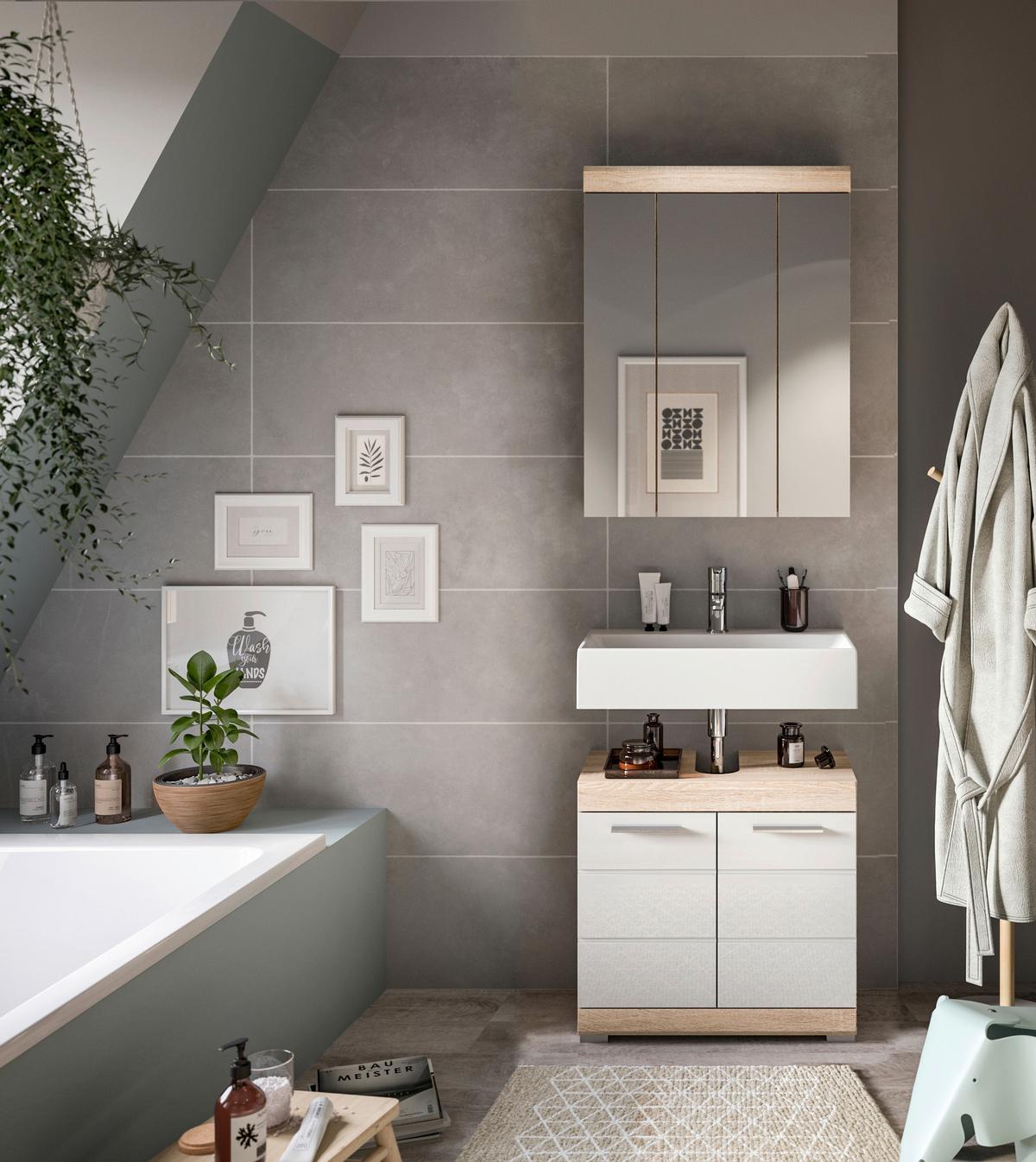 Kúpeľňa Lambada, 2-dielna, biela/dub - biela s vysokým leskom/strieborná, Modern, kompozitné drevo/plast (60cm) - MID.YOU