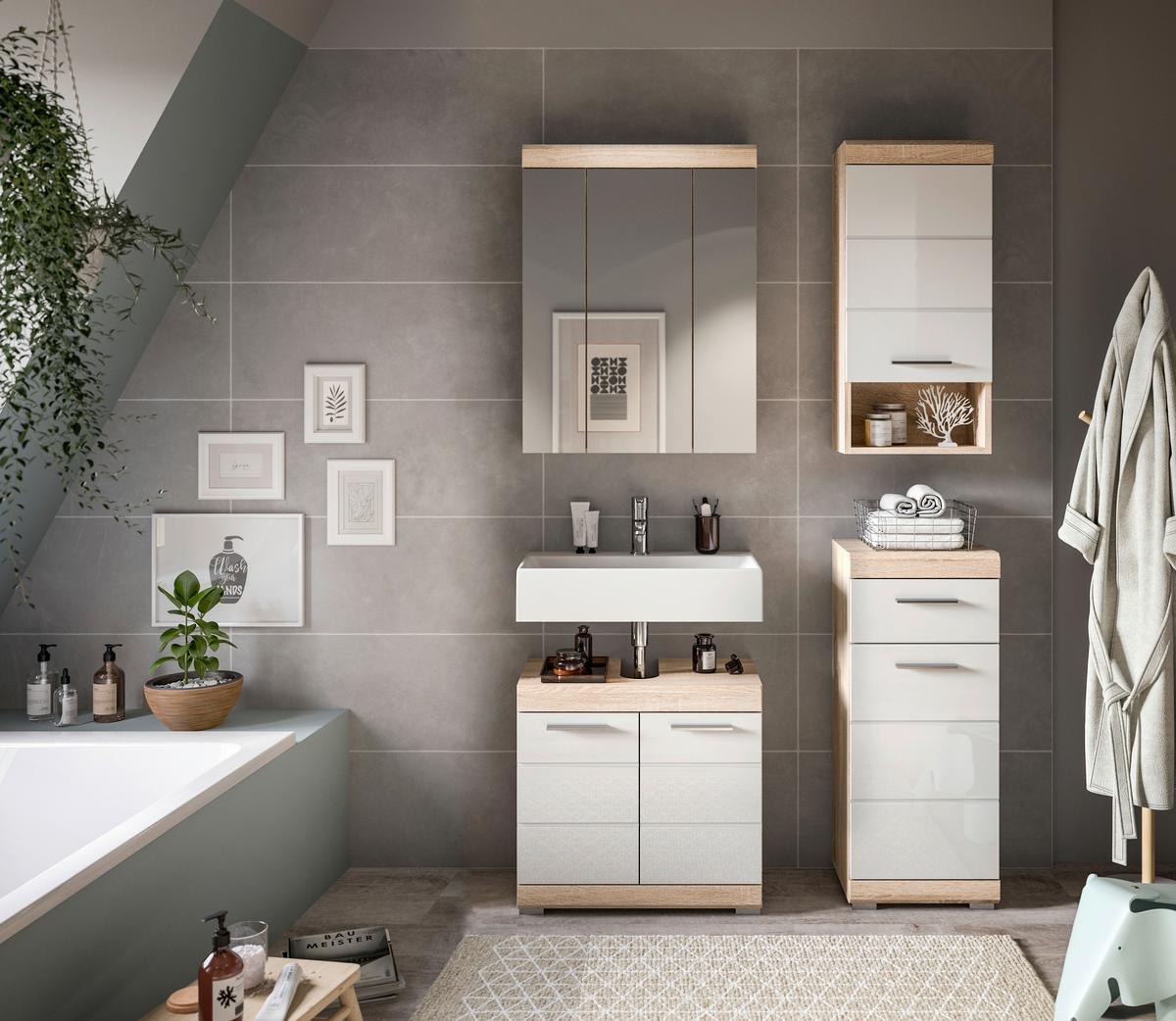 Kúpeľňa Lambada, 4-dielna, biela/dub - biela s vysokým leskom/strieborná, Modern, kompozitné drevo/plast (97cm) - MID.YOU