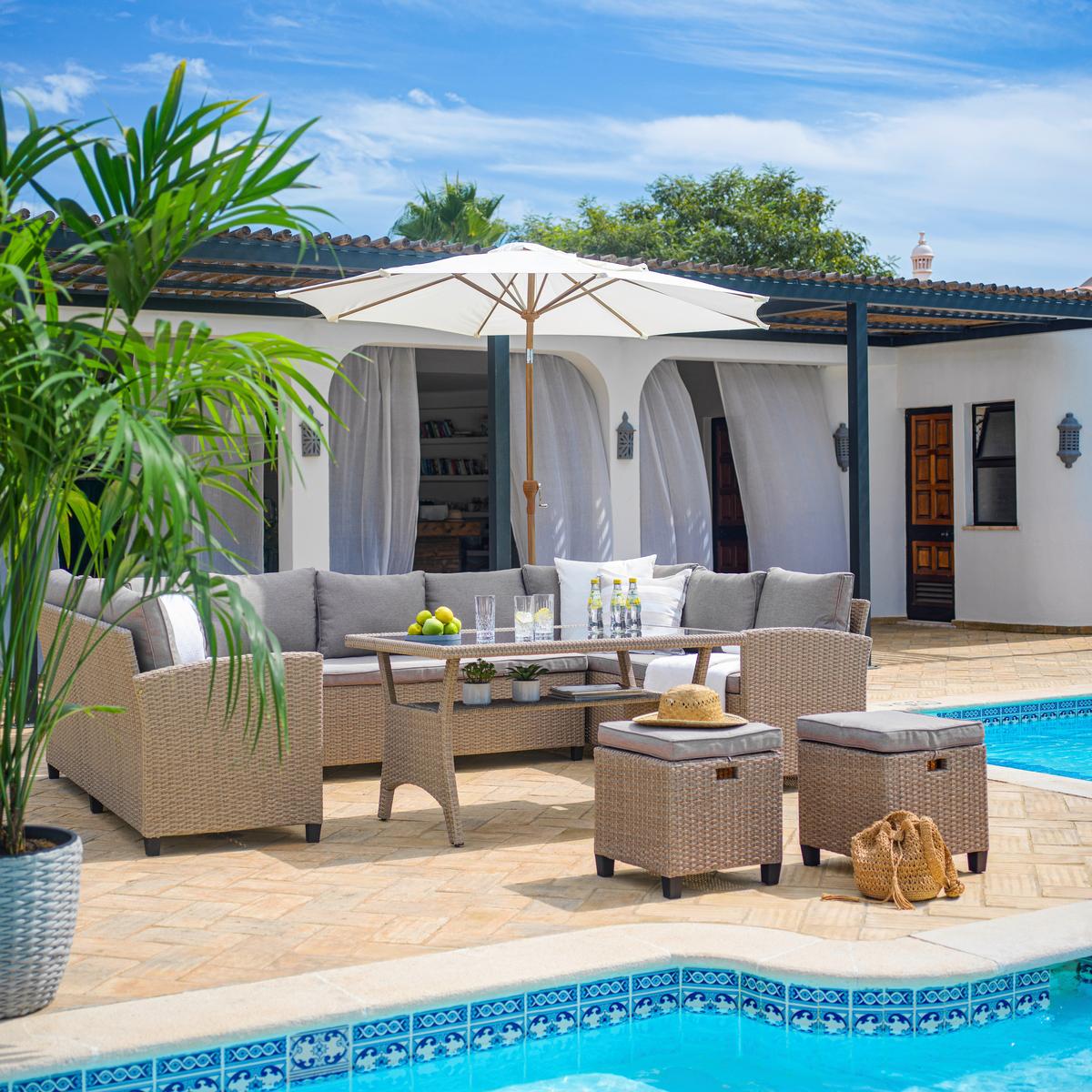 Sedaciu súpravu, vyrobenú z vysokokvalitného polyratanu a stabilného oceľového rámu, možno poskladať do tvaru U a získať tak veľa priestoru na príjemne strávené hodiny vonku. Stôl so sklenenou doskou v čiernej farbe poskytne miesto na občerstvenie. 2 taburetky dopĺňajú túto skvelú súpravu a poskytujú miesto na sedenie naviac.