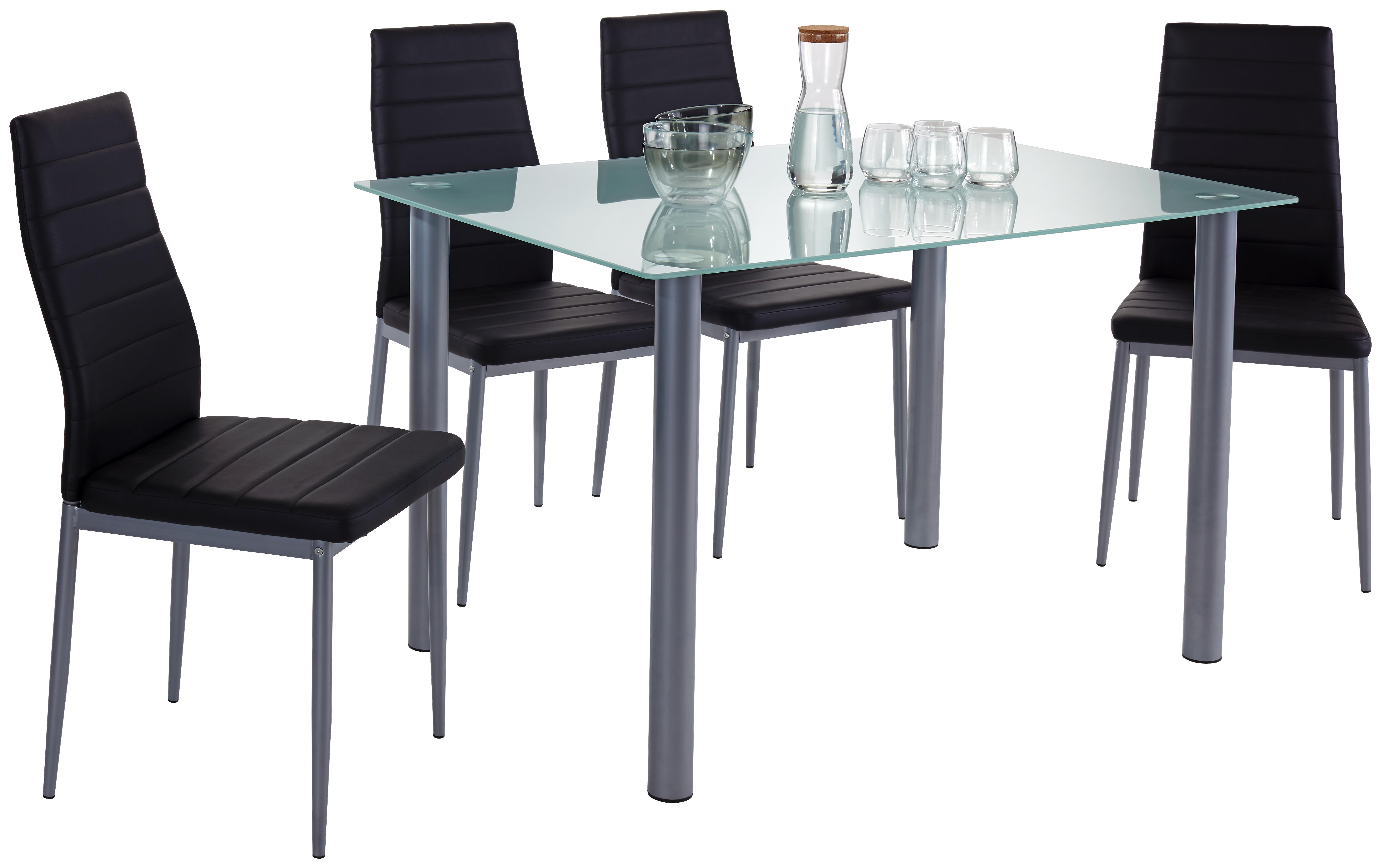 Stolová súprava pozostáva z: 1x stôl, sklenená doska, hrúbka 8 mm, kovové nohy farby alu + 4 stoličky: čierna textilná koža, nosnosť: stôl 50 kg, stoličky:120 kg, Š/V/H: stôl: 80/76/120cm, stoličky: 43/93/42cmMontážny návod